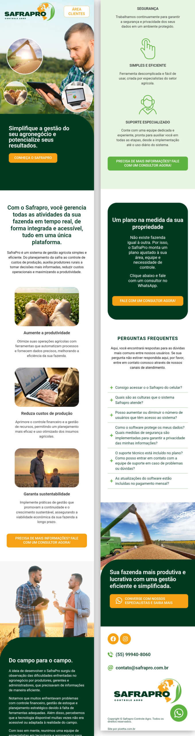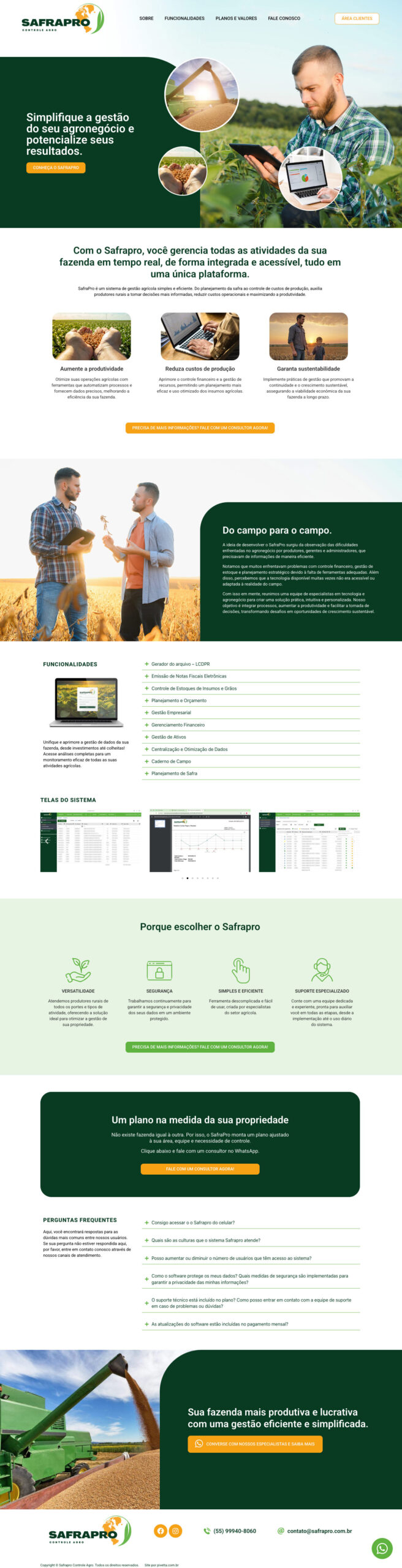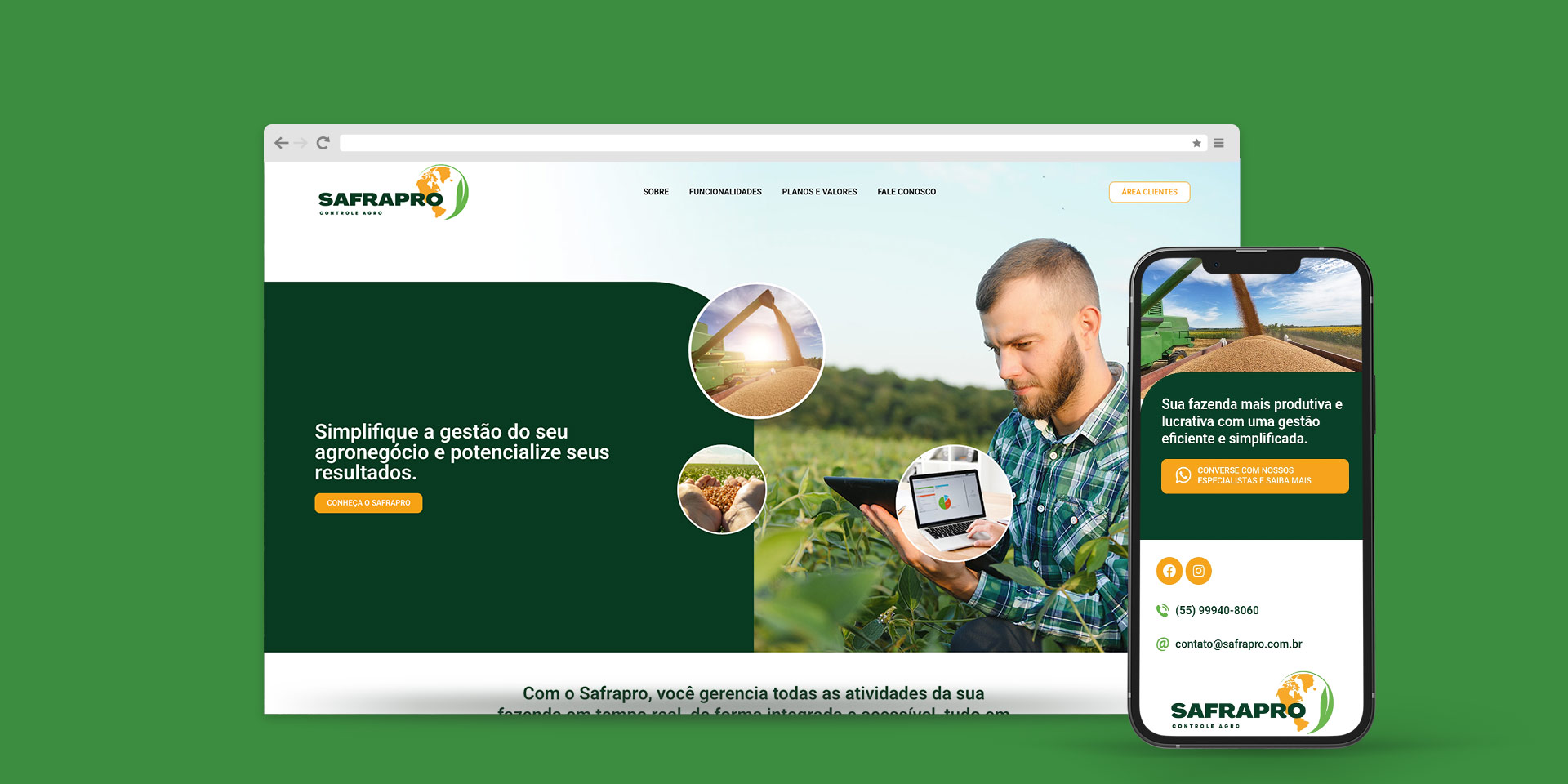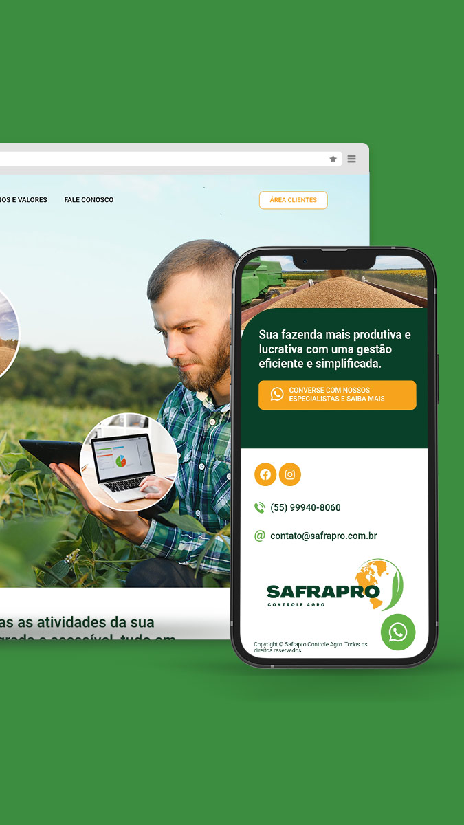 Para consolidar a marca SafraPro no ambiente digital, desenvolvemos uma estratégia completa que unifica tecnologia e conteúdo estratégico. O trabalho contemplou desde a criação de uma landing page de alta performance, focada em usabilidade e conversão, até a gestão de presença no Instagram com conteúdos que educam o público sobre a gestão no campo. Um dos grandes destaques do projeto foi a utilização de inteligência artificial na produção de vídeos e reels dinâmicos, permitindo que processos complexos do sistema fossem comunicados de forma simples e atraente, fortalecendo a conexão da marca com seus clientes e otimizando os resultados de engajamento.